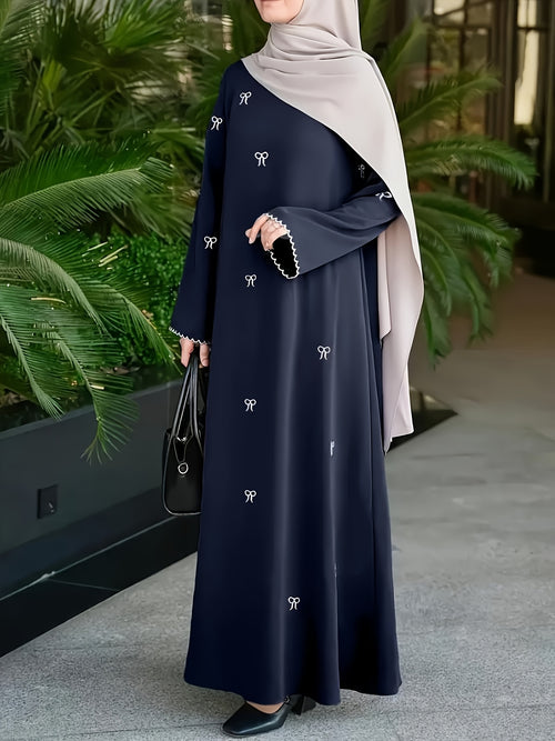 Elegant Long Dress for Middle Eastern Muslims During Ramadan, Featuring Bow Embroidery, Suitable for Casual Outings And Prayers (Abaya Does Not Include a Headscarf)