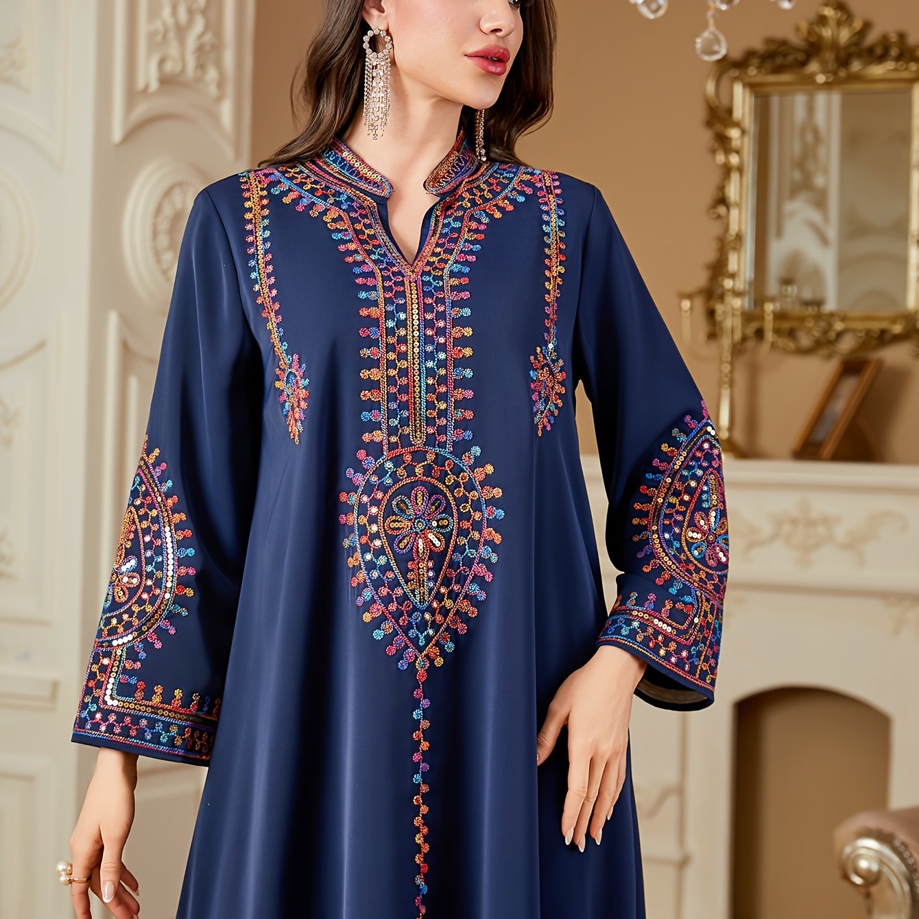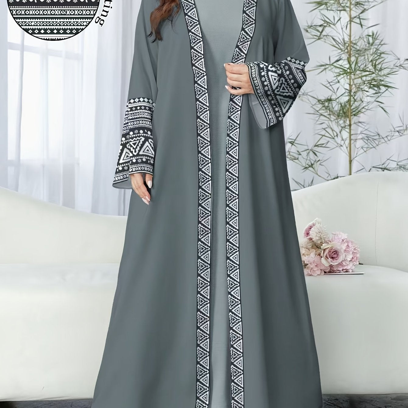 A Mid-Length Dress with a V-Neck, Flared Sleeves, And Slit Design, Featuring Elegant And Luxurious Heat Transfer Craftsmanship, Suitable for The Eid Celebration, Resembling a Traditional Abaya